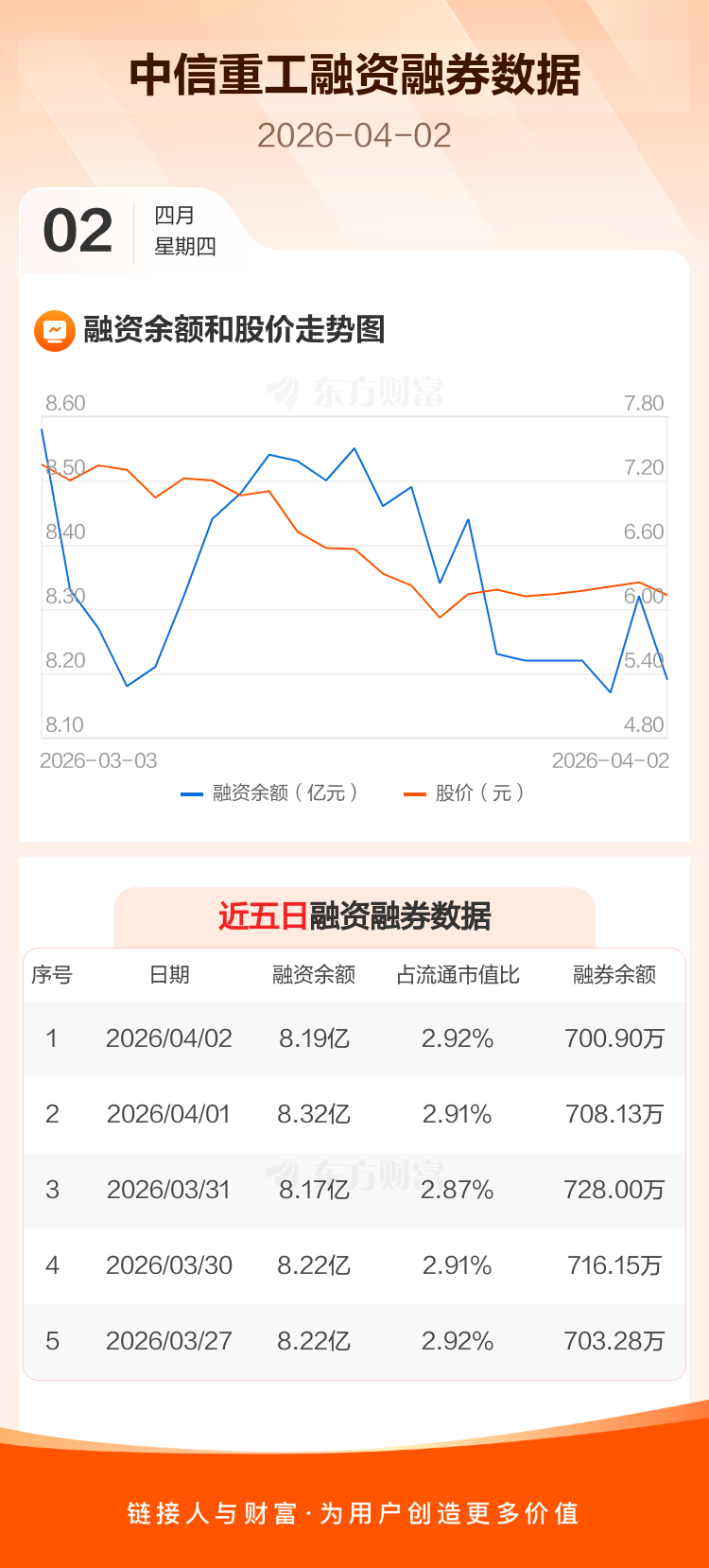 交易所最新数据显示,中信重工于2026年4月2日获融资买入1298.94万元,融资偿还2585.36万元,当日融资净偿还1286.42万元。目前,该股融资余额8.19亿,占流通市值比例为2.92%。