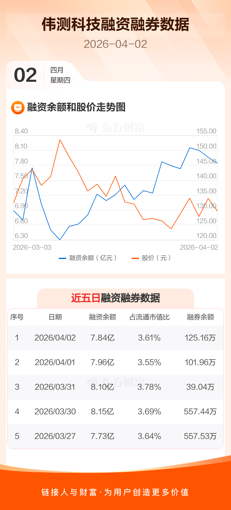 交易所最新数据显示,伟测科技于2026年4月2日获融资买入7015.86万元,融资偿还8184.32万元,当日融资净偿还1168.45万元。目前,该股融资余额7.84亿,占流通市值比例为3.61%。