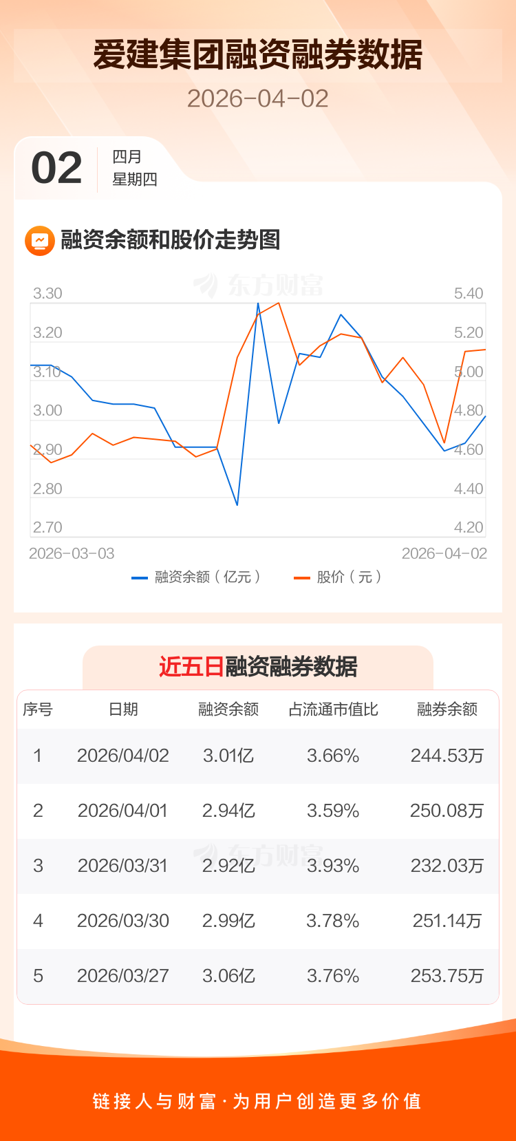 交易所最新数据显示,爱建集团于2026年4月2日获融资买入4336.79万元,融资偿还3668.37万元,当日融资净买入668.42万元。目前,该股融资余额3.01亿,占流通市值比例为3.66%。