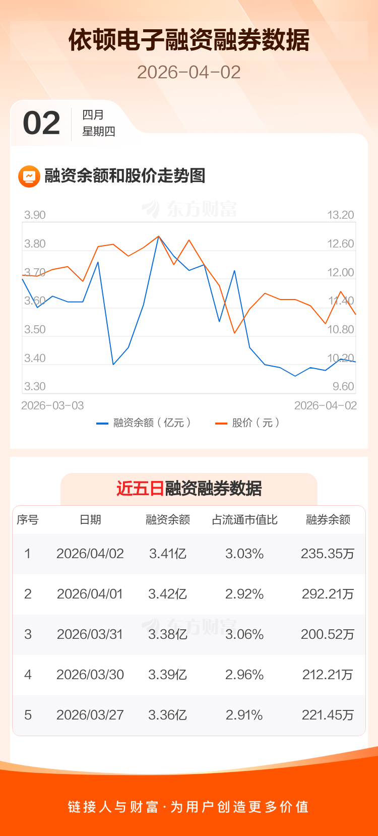 交易所最新数据显示,依顿电子于2026年4月2日获融资买入3024.32万元,融资偿还3158.67万元,当日融资净偿还134.35万元。目前,该股融资余额3.41亿,占流通市值比例为3.03%。