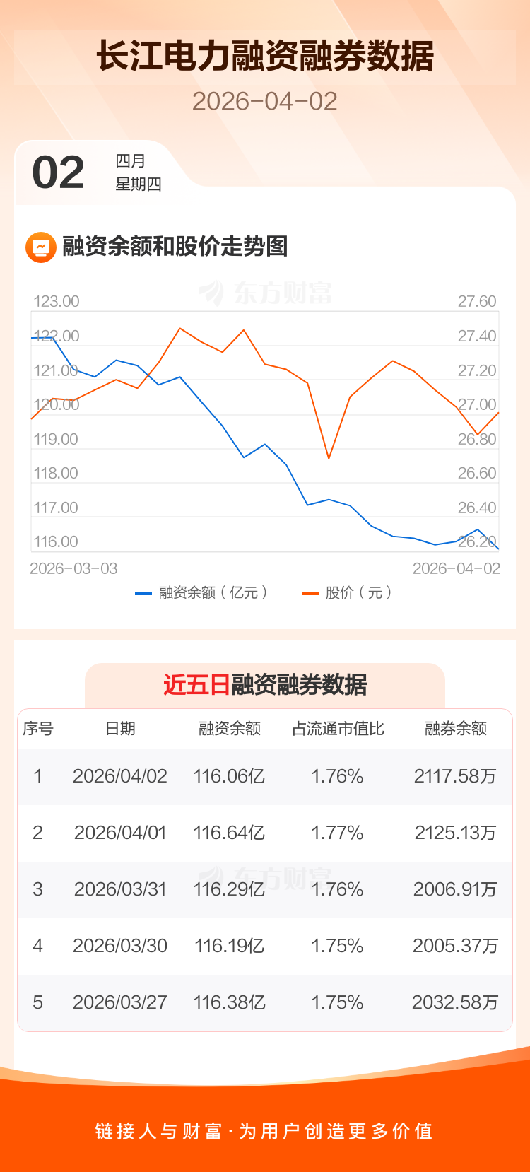 交易所最新数据显示,长江电力于2026年4月2日获融资买入1.11亿元,融资偿还1.69亿元,当日融资净偿还5852.94万元。目前,该股融资余额116.06亿,占流通市值比例为1.76%。