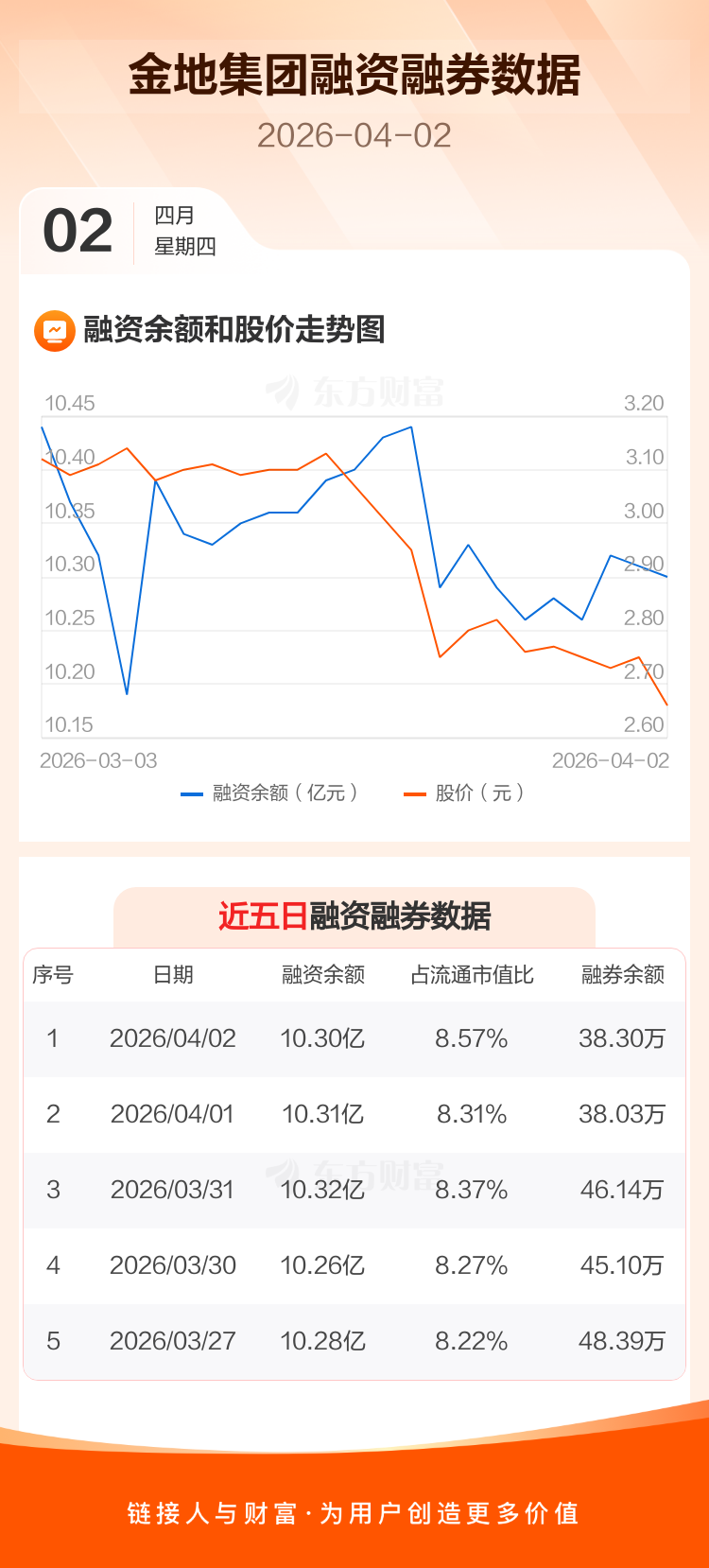 交易所最新数据显示,金地集团于2026年4月2日获融资买入2525.42万元,融资偿还2693.02万元,当日融资净偿还167.61万元。目前,该股融资余额10.30亿,占流通市值比例为8.57%。