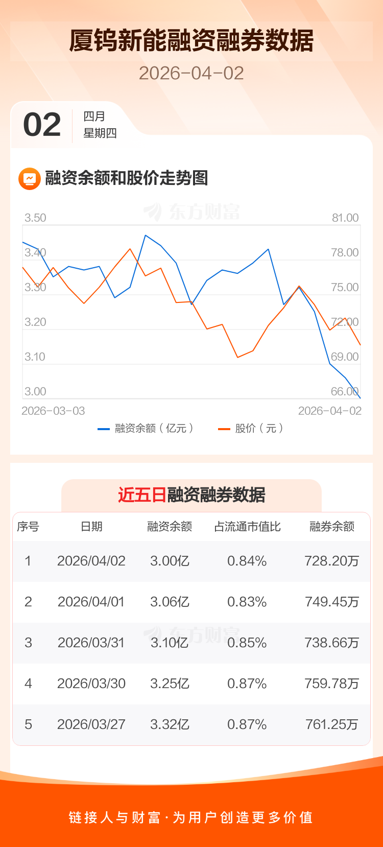 交易所最新数据显示,厦钨新能于2026年4月2日获融资买入1692.02万元,融资偿还2261.10万元,当日融资净偿还569.08万元。目前,该股融资余额3.00亿,占流通市值比例为0.84%。