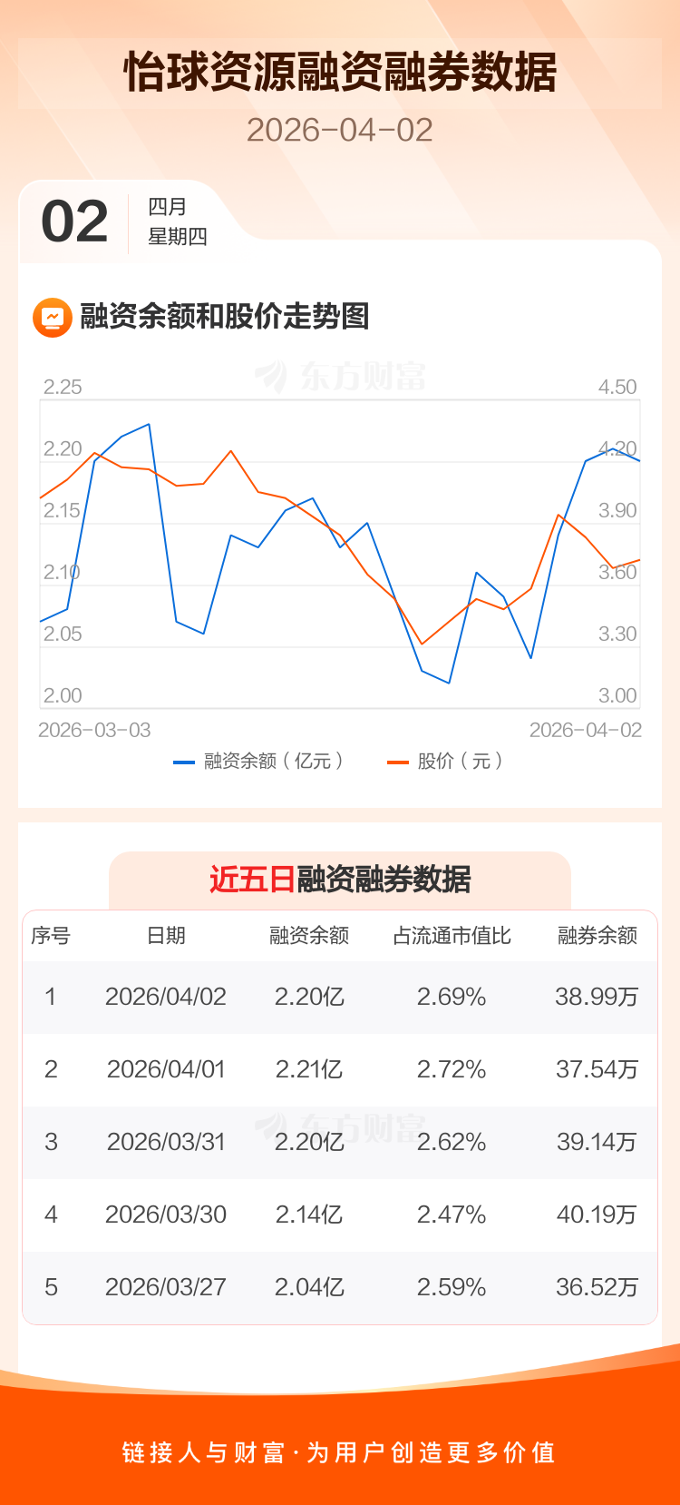 交易所最新数据显示,怡球资源于2026年4月2日获融资买入3375.17万元,融资偿还3432.53万元,当日融资净偿还57.36万元。目前,该股融资余额2.20亿,占流通市值比例为2.69%。