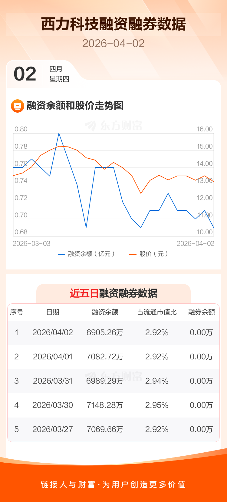 交易所最新数据显示,西力科技于2026年4月2日获融资买入291.01万元,融资偿还468.47万元,当日融资净偿还177.46万元。目前,该股融资余额6905.26万,占流通市值比例为2.92%。