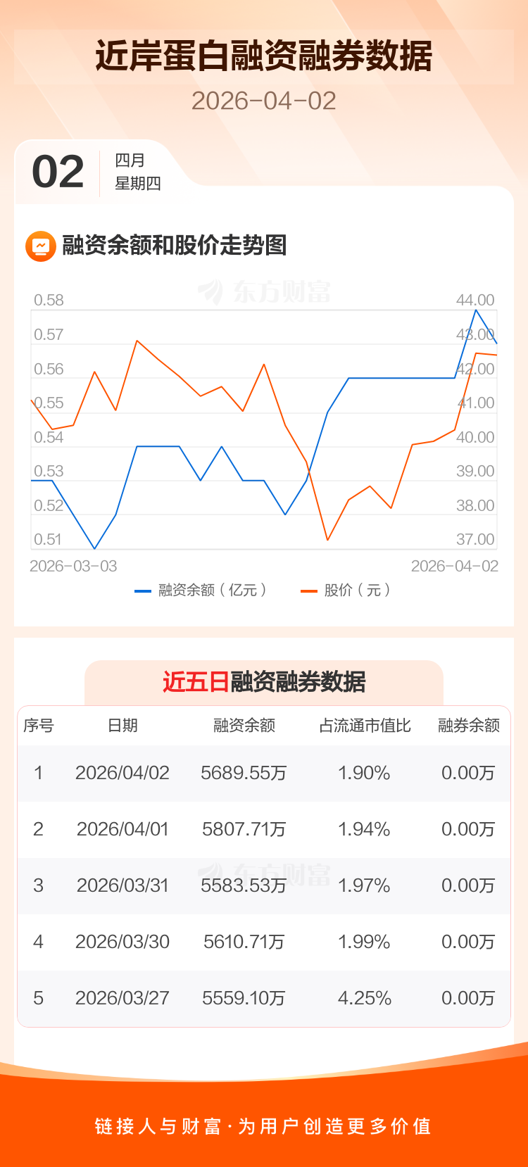 交易所最新数据显示,近岸蛋白于2026年4月2日获融资买入344.15万元,融资偿还462.31万元,当日融资净偿还118.16万元。目前,该股融资余额5689.55万,占流通市值比例为1.90%。