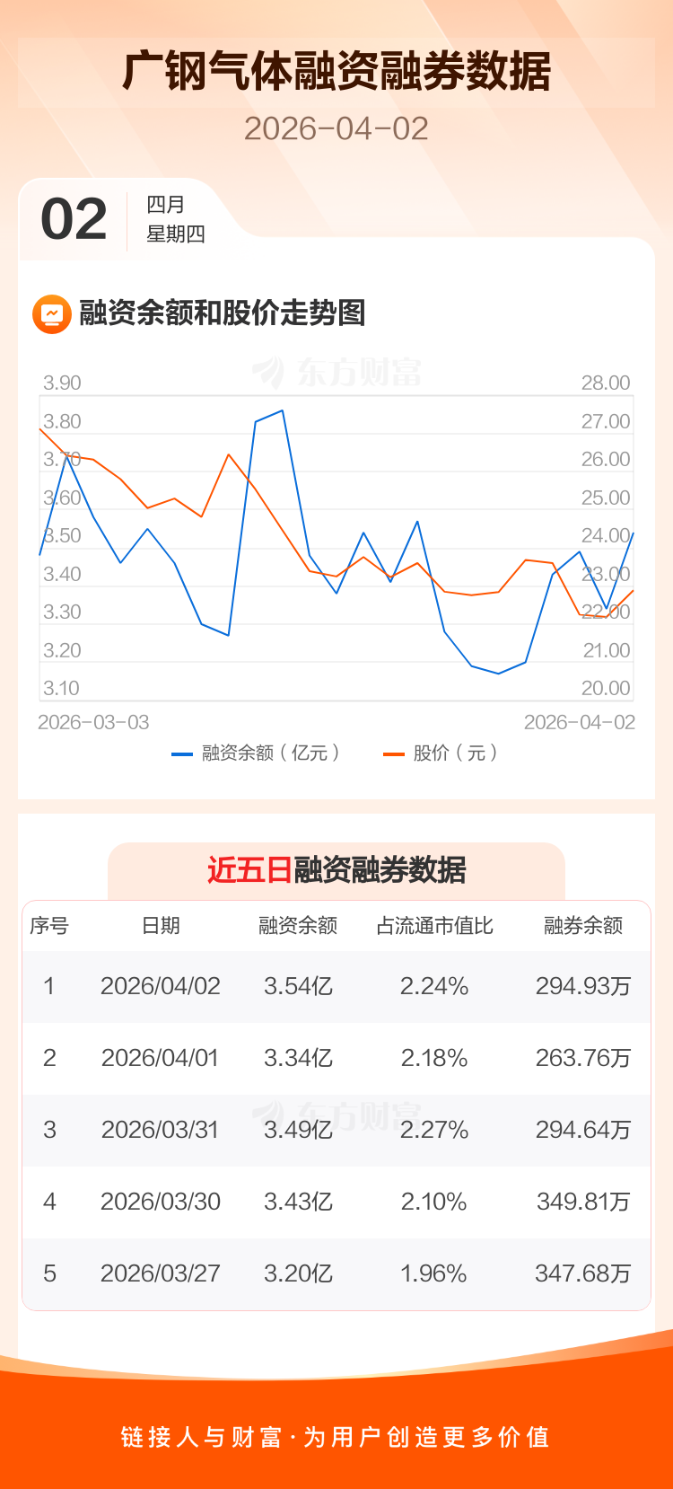 交易所最新数据显示,广钢气体于2026年4月2日获融资买入6004.02万元,融资偿还4051.49万元,当日融资净买入1952.54万元。目前,该股融资余额3.54亿,占流通市值比例为2.24%。