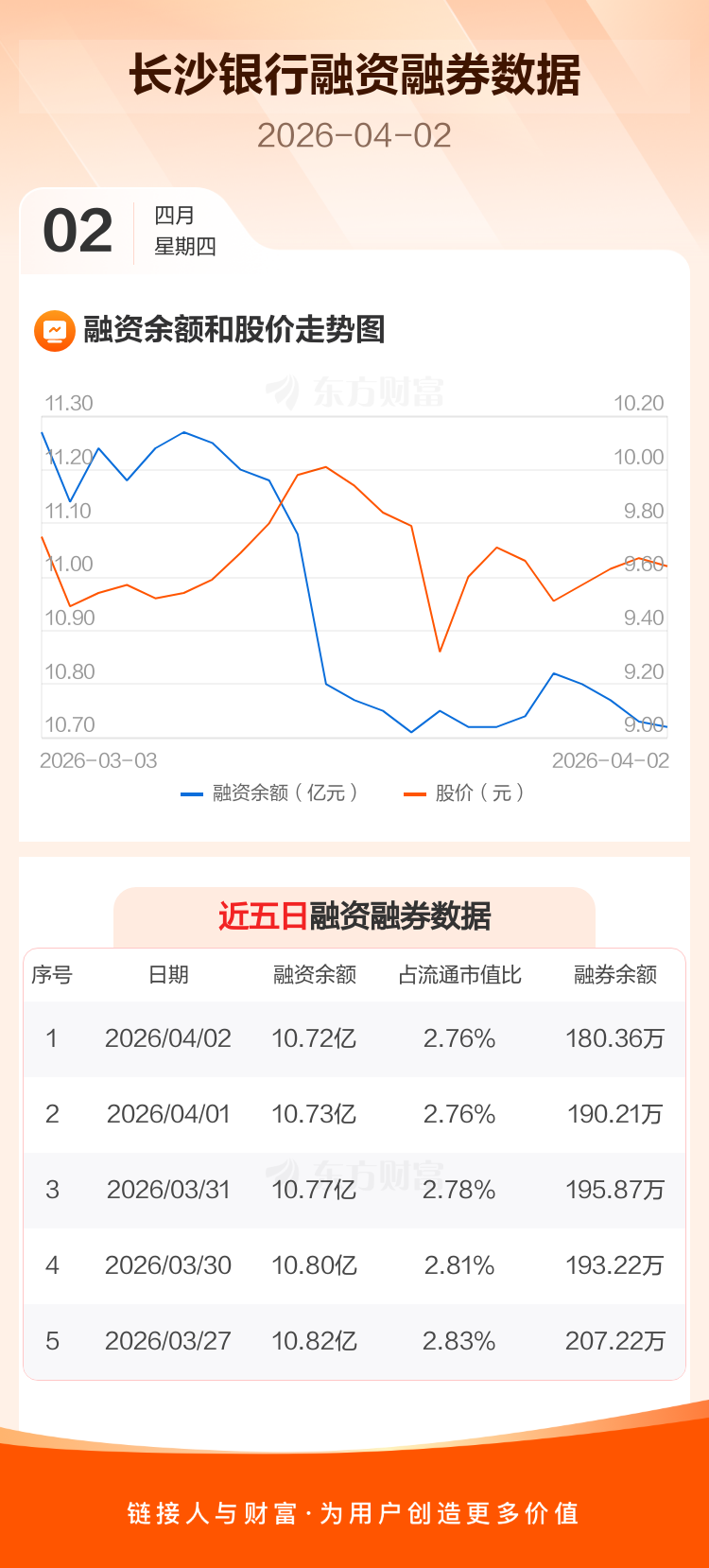 交易所最新数据显示,长沙银行于2026年4月2日获融资买入884.92万元,融资偿还1070.18万元,当日融资净偿还185.26万元。目前,该股融资余额10.72亿,占流通市值比例为2.76%。