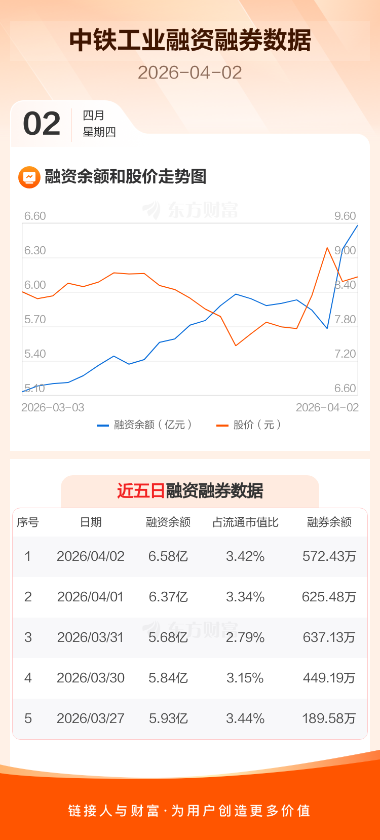 交易所最新数据显示,中铁工业于2026年4月2日获融资买入9648.51万元,融资偿还7593.41万元,当日融资净买入2055.11万元。目前,该股融资余额6.58亿,占流通市值比例为3.42%。