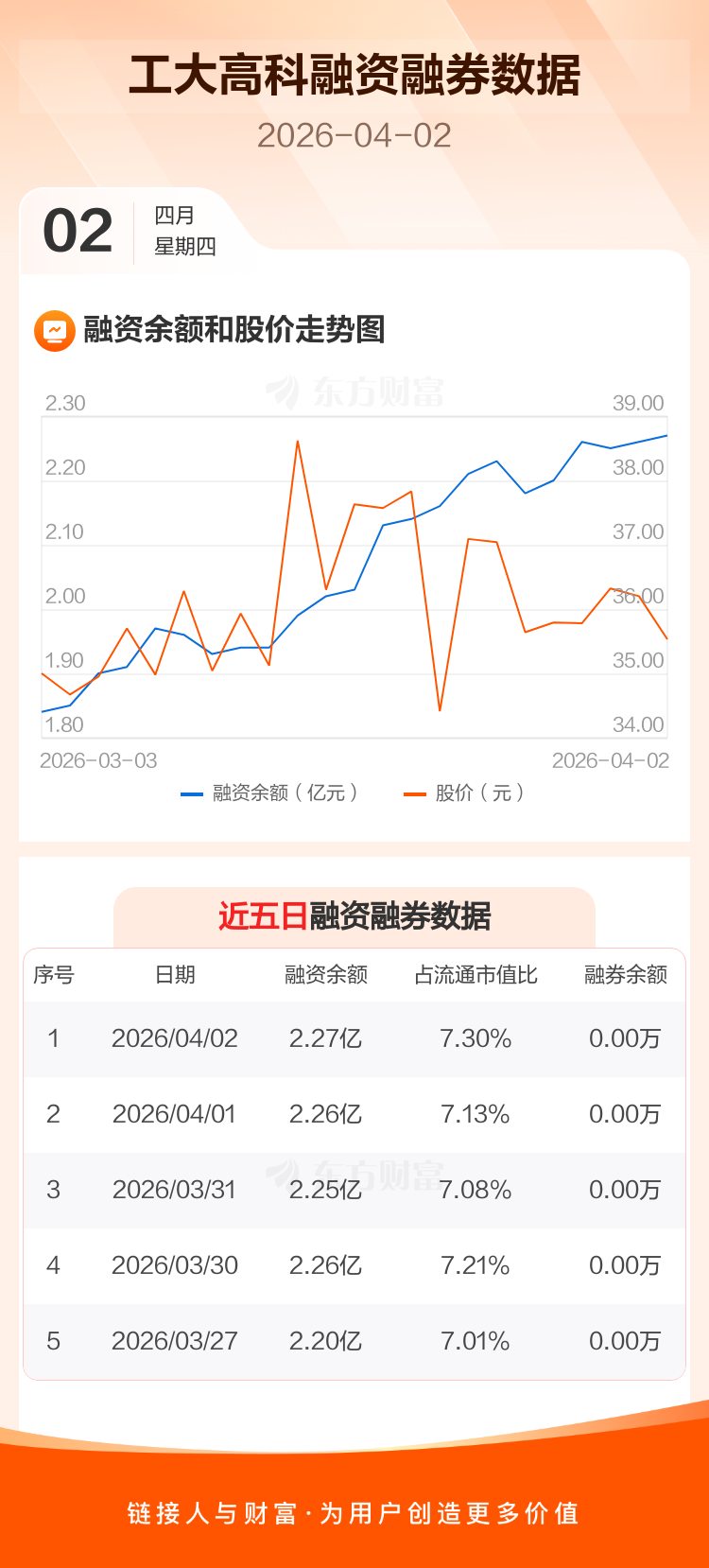 交易所最新数据显示,工大高科于2026年4月2日获融资买入704.41万元,融资偿还582.76万元,当日融资净买入121.65万元。目前,该股融资余额2.27亿,占流通市值比例为7.30%。