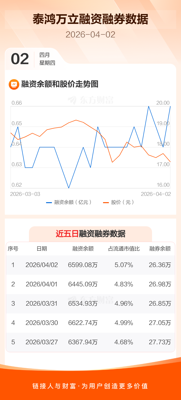 交易所最新数据显示,泰鸿万立于2026年4月2日获融资买入301.16万元,融资偿还147.17万元,当日融资净买入153.99万元。目前,该股融资余额6599.08万,占流通市值比例为5.07%。