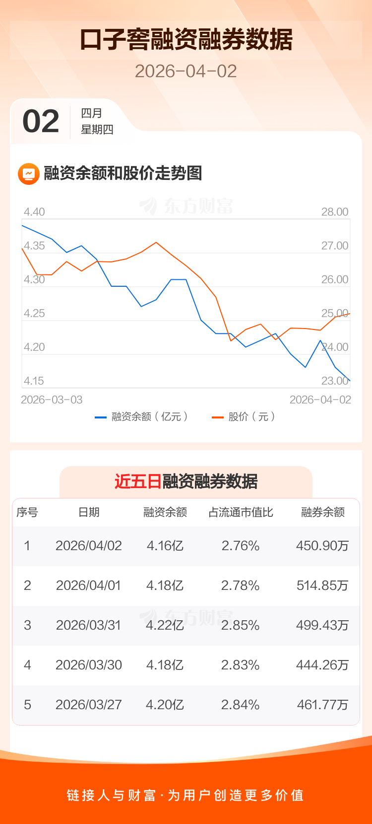 交易所最新数据显示,口子窖于2026年4月2日获融资买入763.13万元,融资偿还914.32万元,当日融资净偿还151.19万元。目前,该股融资余额4.16亿,占流通市值比例为2.76%。