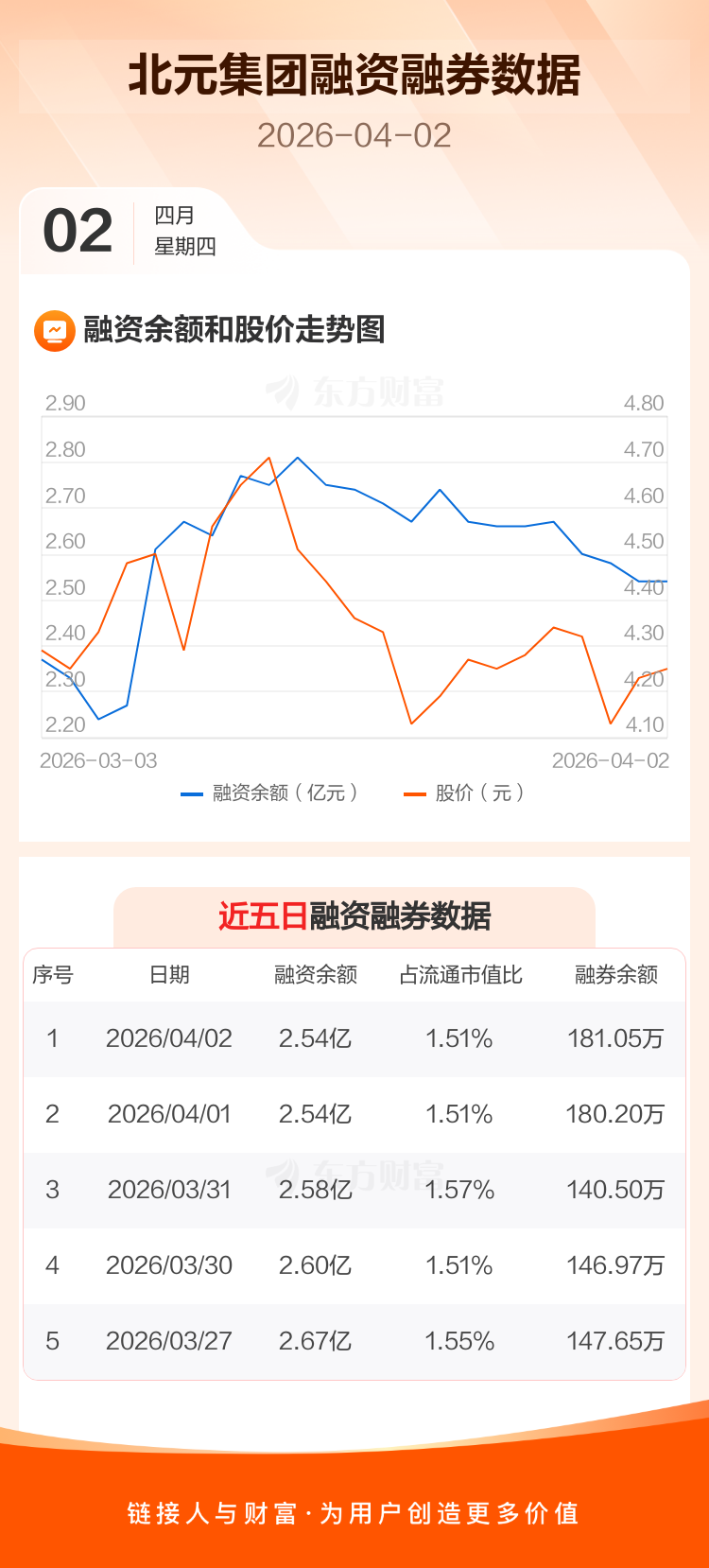 交易所最新数据显示,北元集团于2026年4月2日获融资买入711.31万元,融资偿还650.25万元,当日融资净买入61.06万元。目前,该股融资余额2.54亿,占流通市值比例为1.51%。
