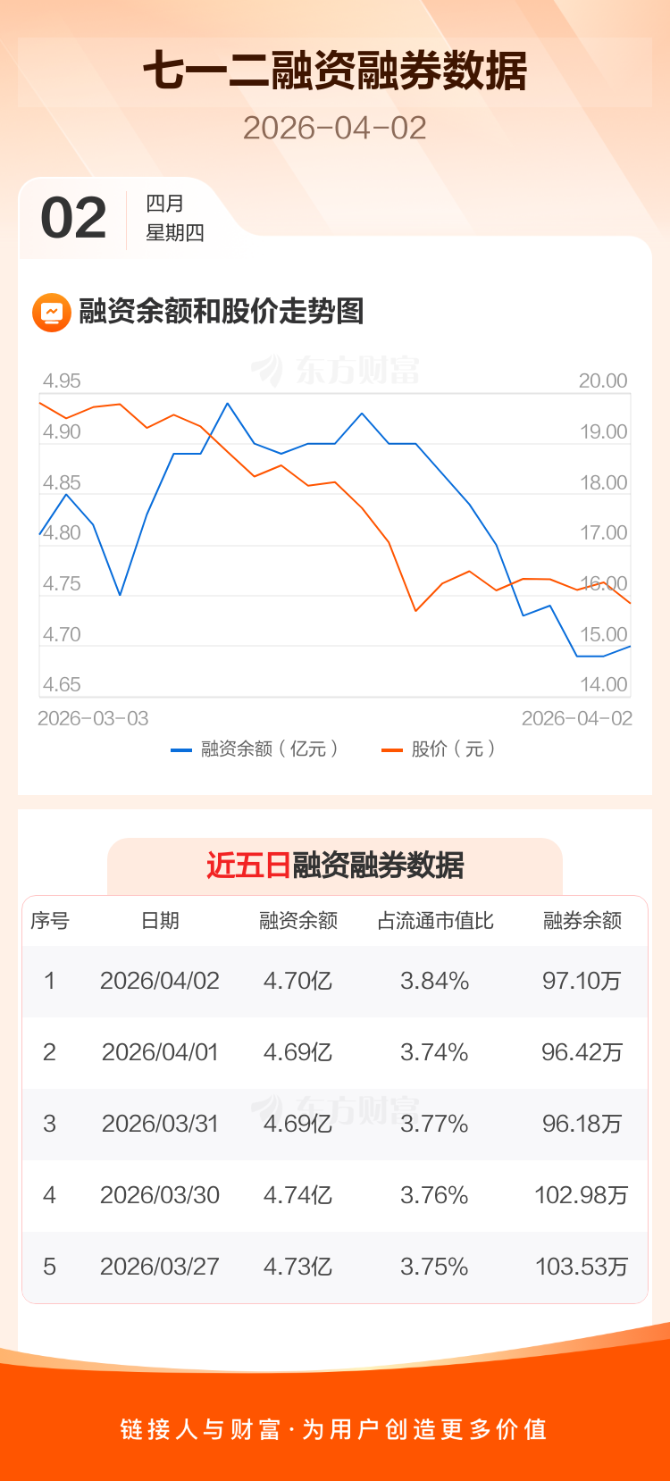 交易所最新数据显示,七一二于2026年4月2日获融资买入853.68万元,融资偿还798.89万元,当日融资净买入54.79万元。目前,该股融资余额4.70亿,占流通市值比例为3.84%。