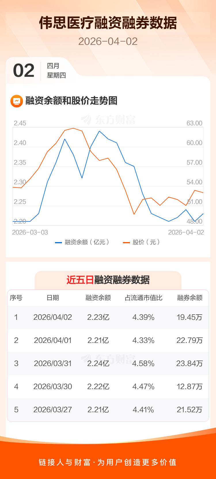 交易所最新数据显示,伟思医疗于2026年4月2日获融资买入1169.36万元,融资偿还1017.92万元,当日融资净买入151.45万元。目前,该股融资余额2.23亿,占流通市值比例为4.39%。