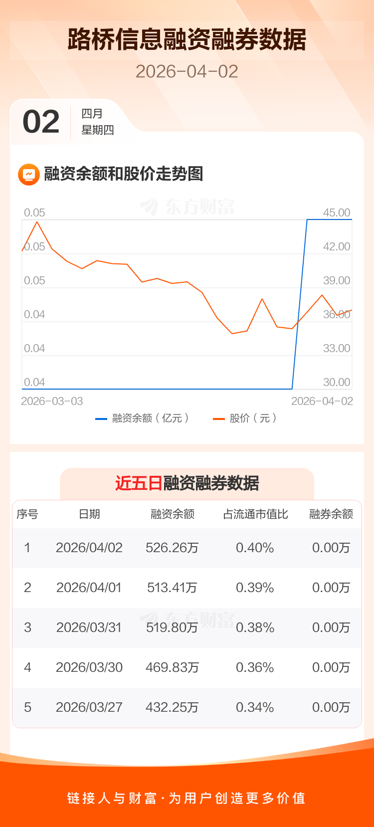 交易所最新数据显示,路桥信息于2026年4月2日获融资买入36.50万元,融资偿还23.65万元,当日融资净买入12.85万元。目前,该股融资余额526.26万,占流通市值比例为0.40%。