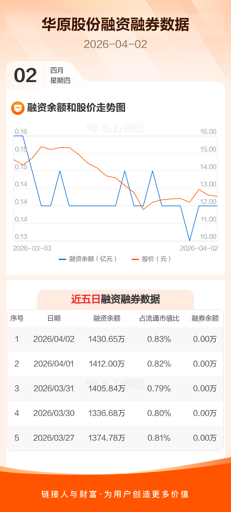 交易所最新数据显示,华原股份于2026年4月2日获融资买入133.94万元,融资偿还115.29万元,当日融资净买入18.64万元。目前,该股融资余额1430.65万,占流通市值比例为0.83%。