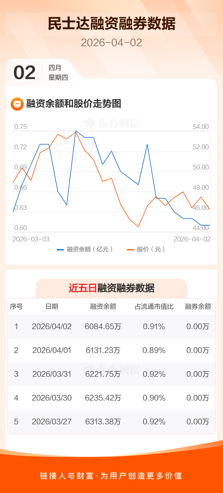 交易所最新数据显示,民士达于2026年4月2日获融资买入228.42万元,融资偿还275.00万元,当日融资净偿还46.58万元。目前,该股融资余额6084.65万,占流通市值比例为0.91%。