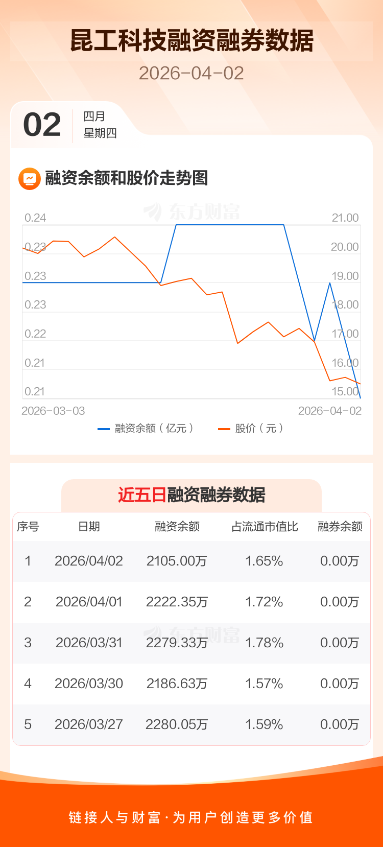 交易所最新数据显示,昆工科技于2026年4月2日获融资买入44.06万元,融资偿还161.41万元,当日融资净偿还117.35万元。目前,该股融资余额2105.00万,占流通市值比例为1.65%。