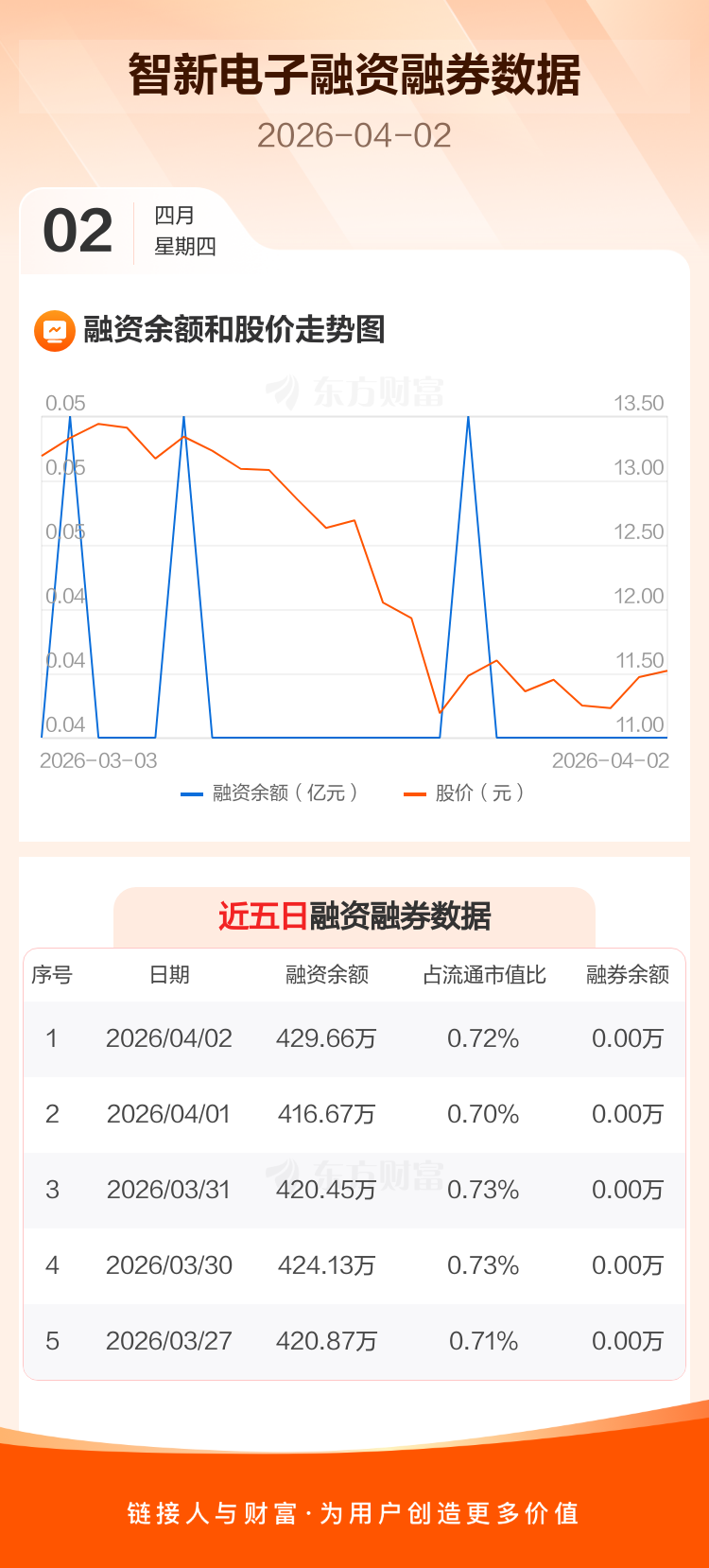交易所最新数据显示,智新电子于2026年4月2日获融资买入51.12万元,融资偿还38.14万元,当日融资净买入12.98万元。目前,该股融资余额429.66万,占流通市值比例为0.72%。