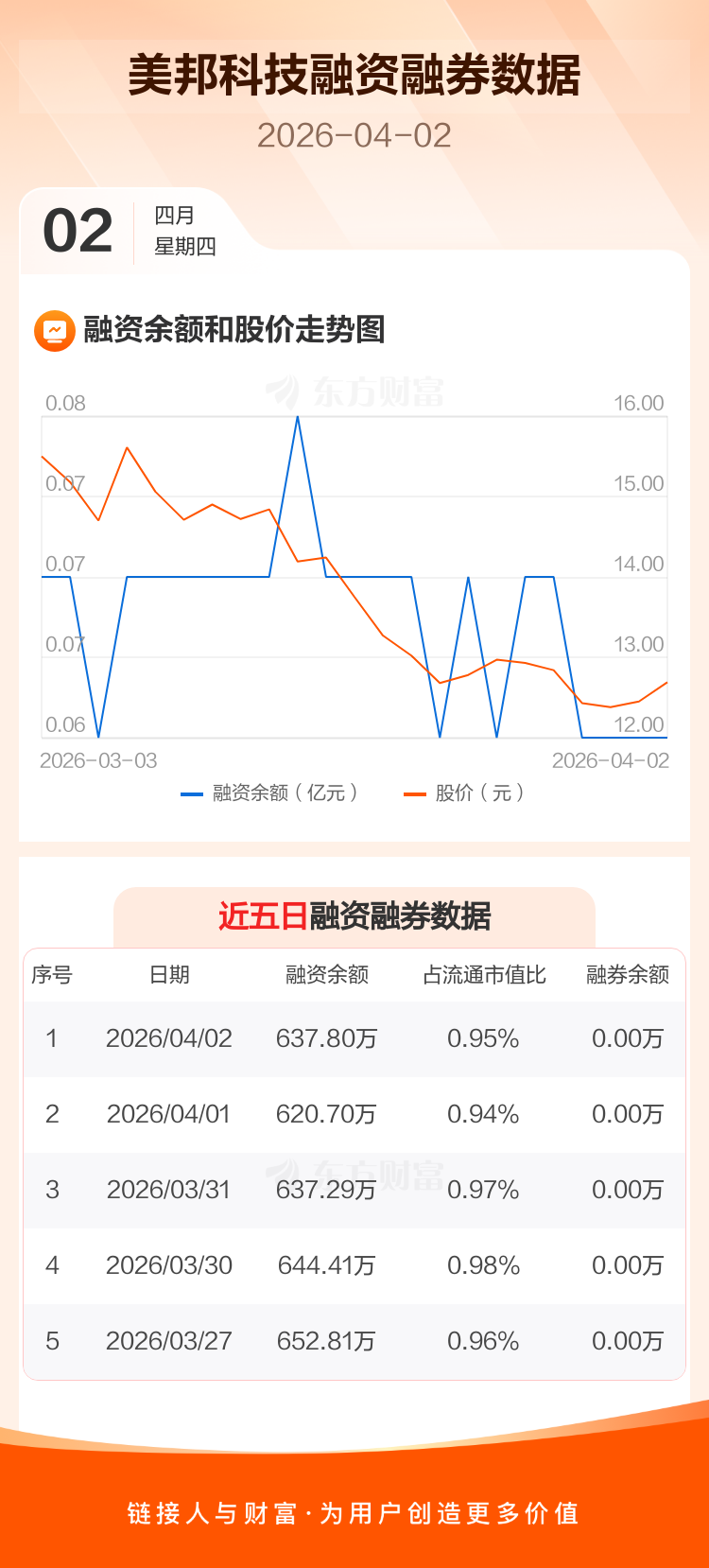 交易所最新数据显示,美邦科技于2026年4月2日获融资买入23.80万元,融资偿还6.70万元,当日融资净买入17.1万元。目前,该股融资余额637.80万,占流通市值比例为0.95%。