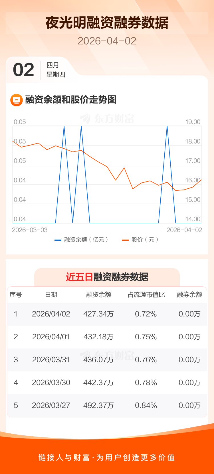 交易所最新数据显示,夜光明于2026年4月2日获融资买入94.90万元,融资偿还99.74万元,当日融资净偿还4.84万元。目前,该股融资余额427.34万,占流通市值比例为0.72%。