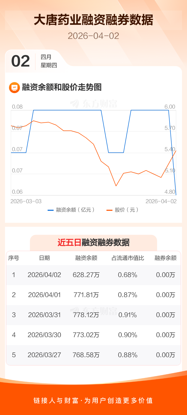 交易所最新数据显示,大唐药业于2026年4月2日获融资买入78.17万元,融资偿还221.70万元,当日融资净偿还143.54万元。目前,该股融资余额628.27万,占流通市值比例为0.68%。
