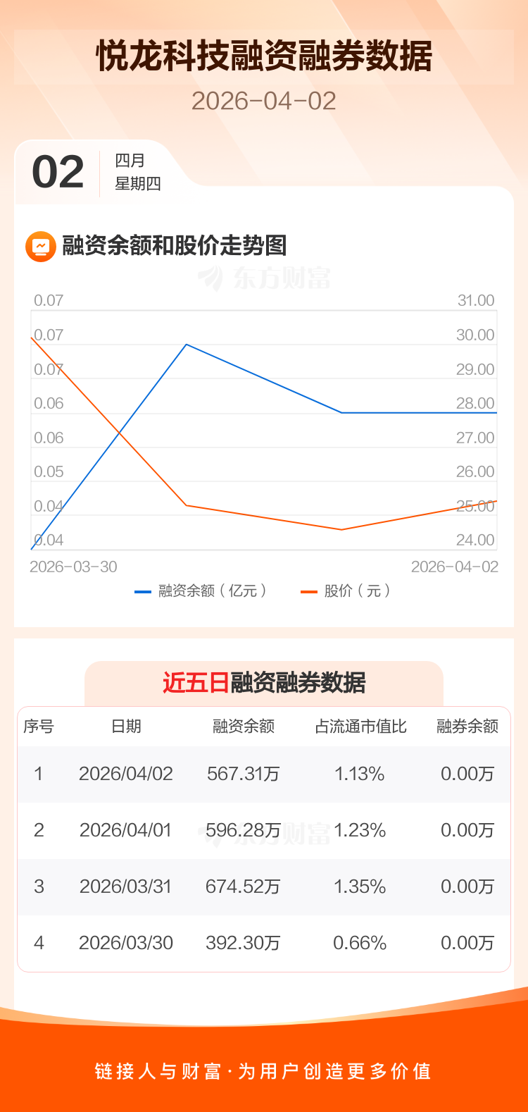 交易所最新数据显示,悦龙科技于2026年4月2日获融资买入223.65万元,融资偿还252.62万元,当日融资净偿还28.97万元。目前,该股融资余额567.31万,占流通市值比例为1.13%。