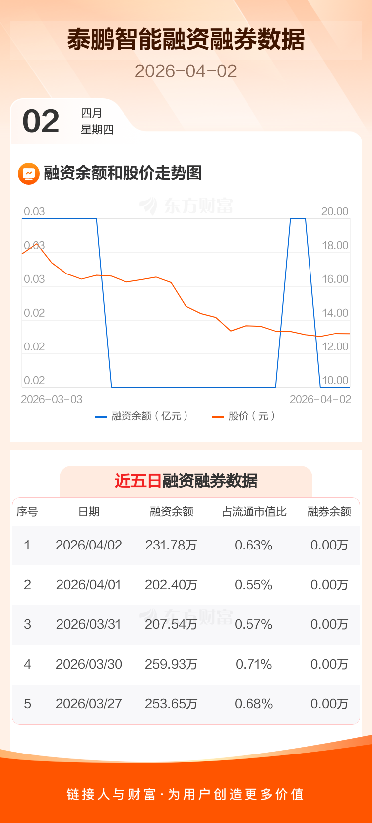 交易所最新数据显示,泰鹏智能于2026年4月2日获融资买入76.81万元,融资偿还47.43万元,当日融资净买入29.38万元。目前,该股融资余额231.78万,占流通市值比例为0.63%。