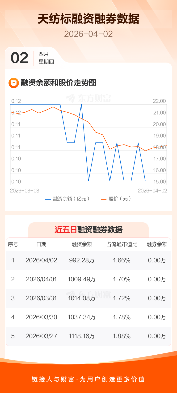 天纺标:融资净偿还17.22万元,融资余额992.28万元