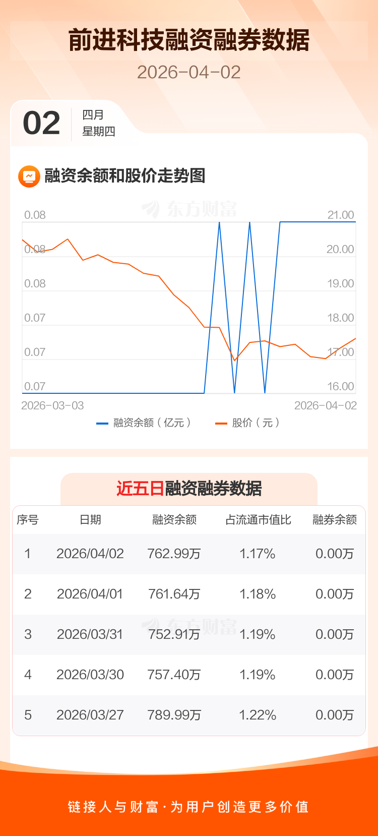 交易所最新数据显示,前进科技于2026年4月2日获融资买入35.29万元,融资偿还33.95万元,当日融资净买入1.35万元。目前,该股融资余额762.99万,占流通市值比例为1.17%。
