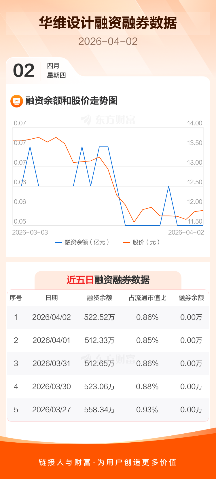 交易所最新数据显示,华维设计于2026年4月2日获融资买入20.47万元,融资偿还10.28万元,当日融资净买入10.19万元。目前,该股融资余额522.52万,占流通市值比例为0.86%。