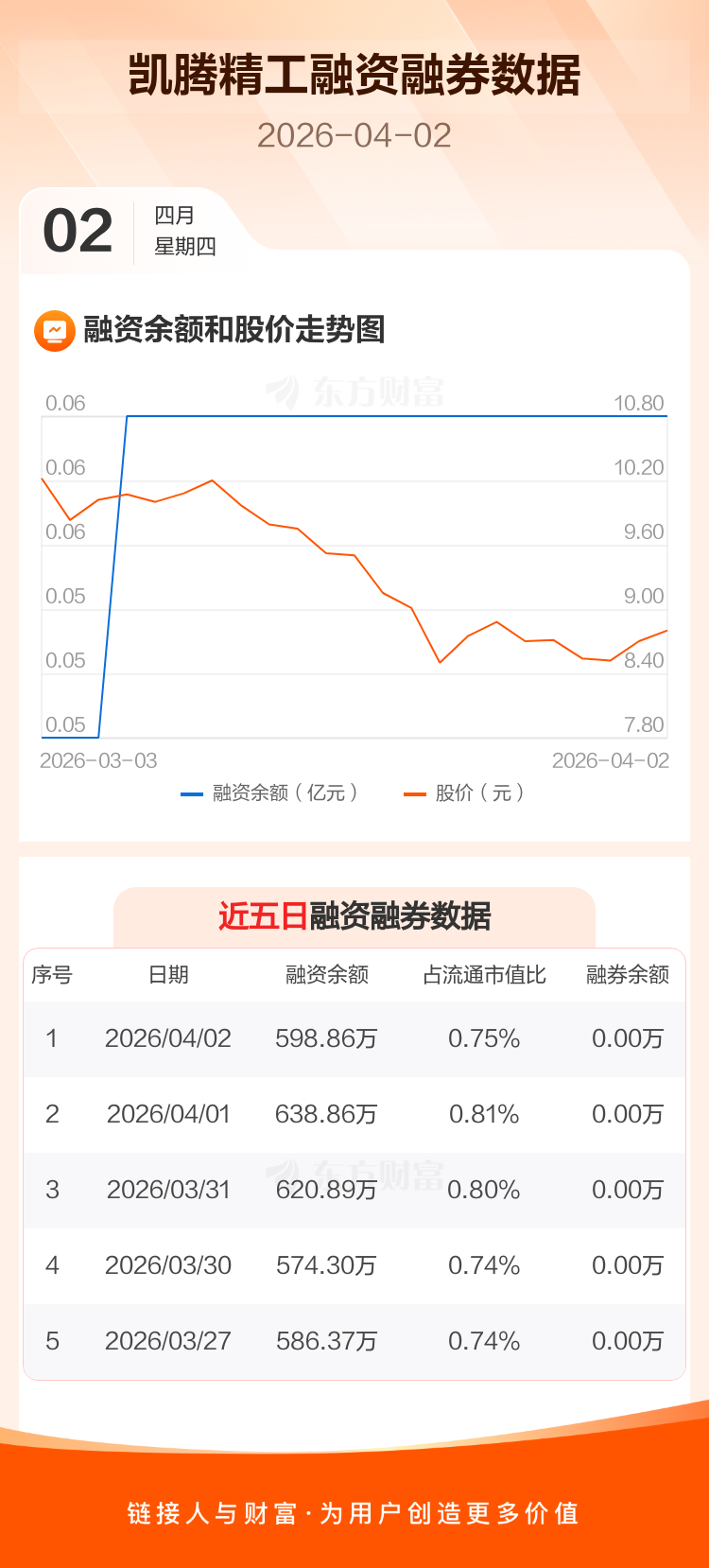 交易所最新数据显示,凯腾精工于2026年4月2日获融资买入123.52万元,融资偿还163.52万元,当日融资净偿还40万元。目前,该股融资余额598.86万,占流通市值比例为0.75%。