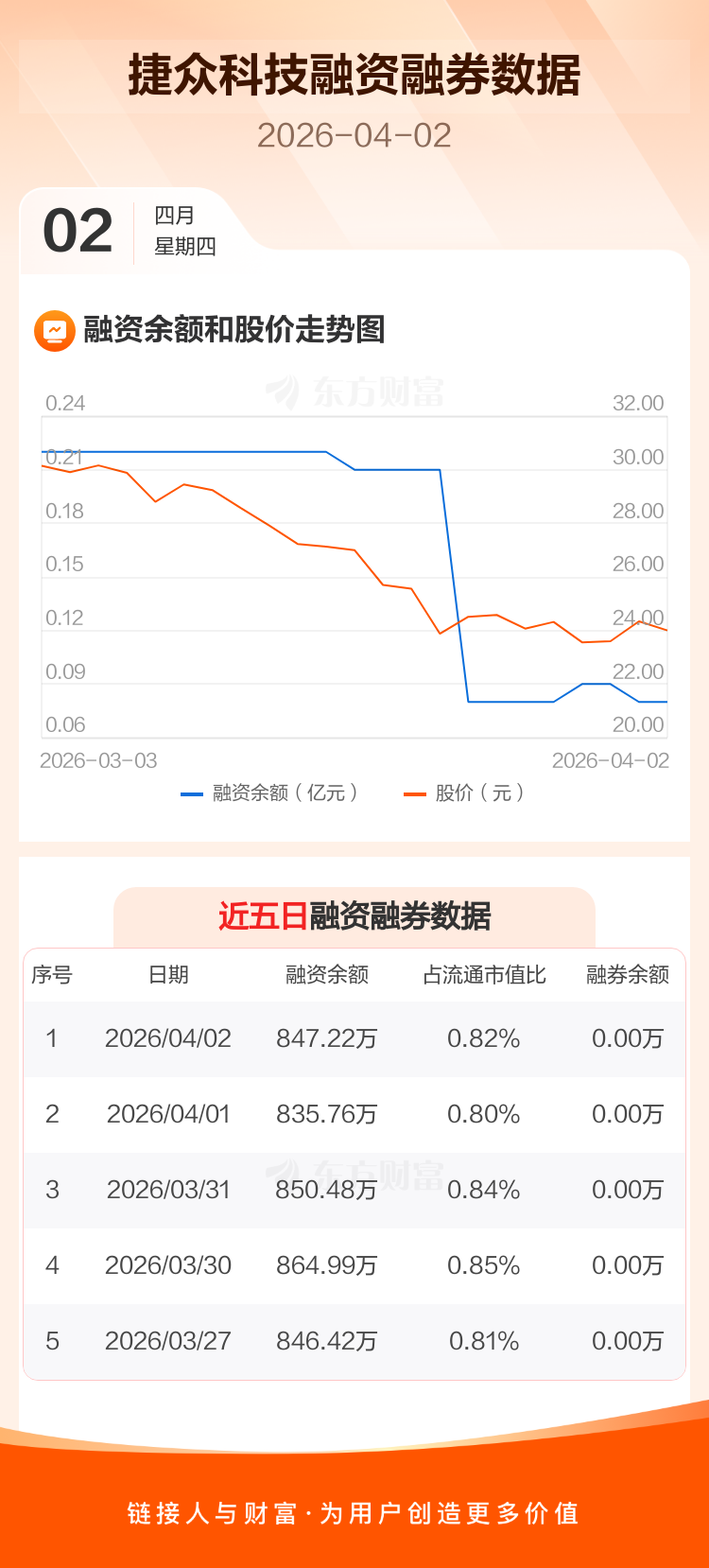 交易所最新数据显示,捷众科技于2026年4月2日获融资买入36.29万元,融资偿还24.83万元,当日融资净买入11.46万元。目前,该股融资余额847.22万,占流通市值比例为0.82%。