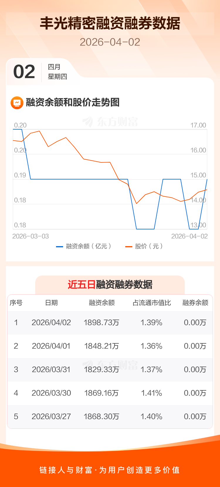 交易所最新数据显示,丰光精密于2026年4月2日获融资买入61.87万元,融资偿还11.35万元,当日融资净买入50.52万元。目前,该股融资余额1898.73万,占流通市值比例为1.39%。