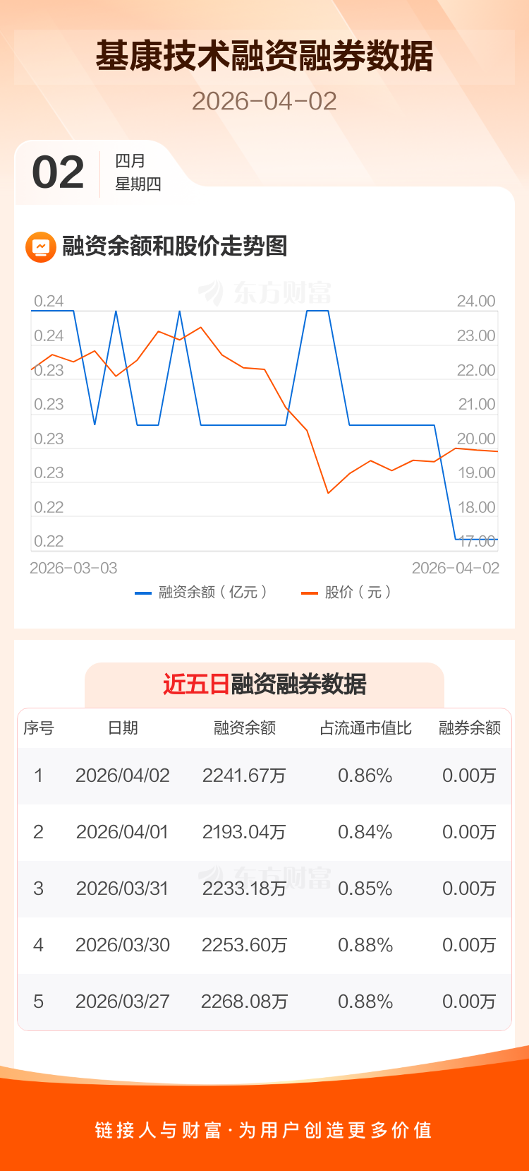 交易所最新数据显示,基康技术于2026年4月2日获融资买入77.55万元,融资偿还28.92万元,当日融资净买入48.63万元。目前,该股融资余额2241.67万,占流通市值比例为0.86%。