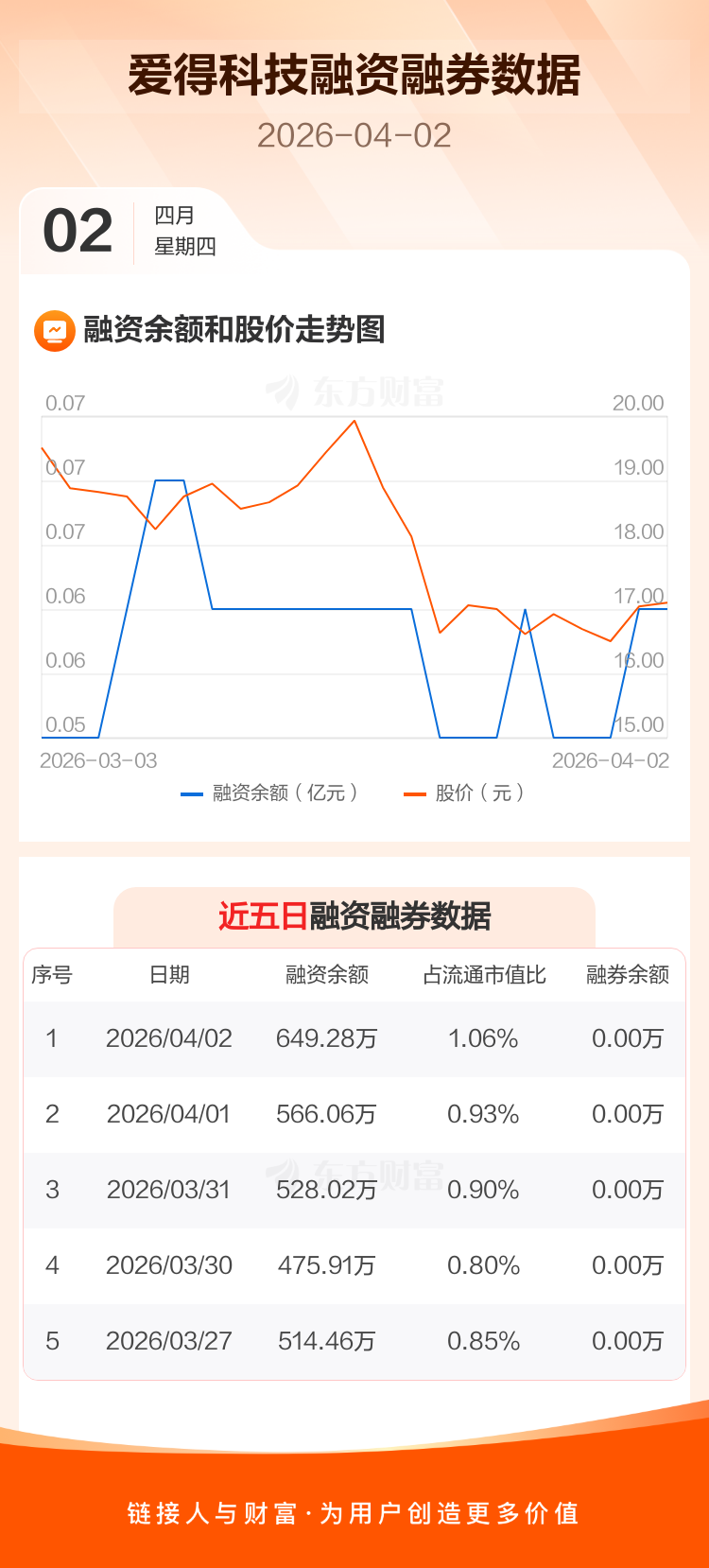 交易所最新数据显示,爱得科技于2026年4月2日获融资买入97.31万元,融资偿还14.09万元,当日融资净买入83.22万元。目前,该股融资余额649.28万,占流通市值比例为1.06%。
