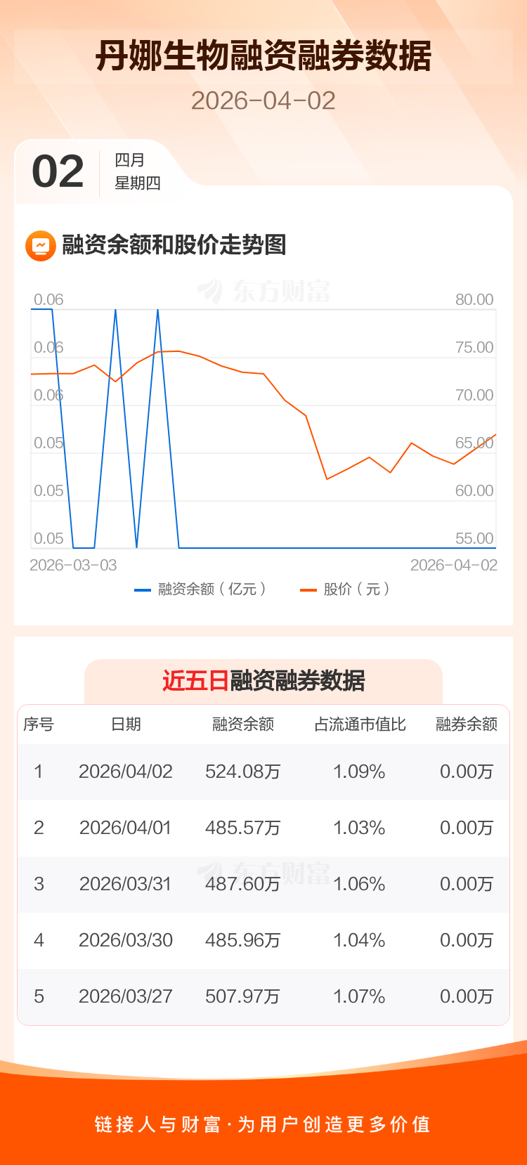 交易所最新数据显示,丹娜生物于2026年4月2日获融资买入50.74万元,融资偿还12.23万元,当日融资净买入38.51万元。目前,该股融资余额524.08万,占流通市值比例为1.09%。