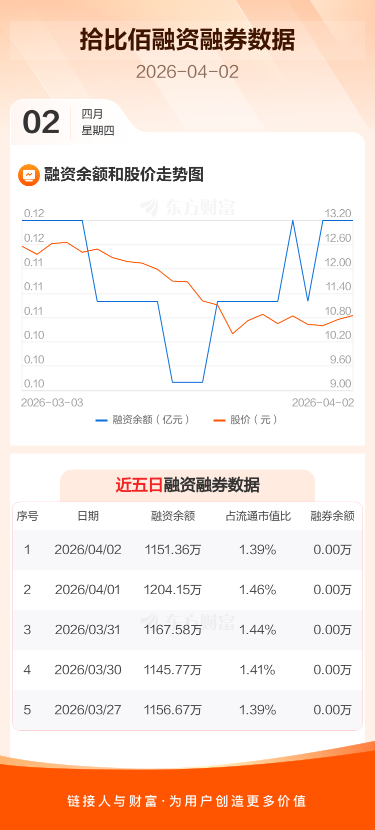 交易所最新数据显示,拾比佰于2026年4月2日获融资买入82.22万元,融资偿还135.02万元,当日融资净偿还52.79万元。目前,该股融资余额1151.36万,占流通市值比例为1.39%。
