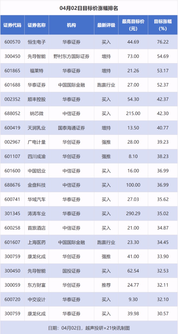 越声投研数据显示,4月2日,券商给予上市公司目标价共75次,按最新收盘价计算,目标价涨幅排名居前的公司有恒生电子、先导智能、福莱特,目标价涨幅分别为76.22%、54.69%、53.17%,分别属于软件开发、电池、光伏设备行业。