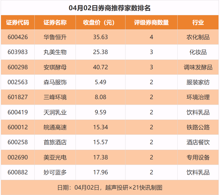 从券商推荐家数来看,4月2日有149家上市公司得到券商推荐,其中华鲁恒升获得4家推荐,丸美生物、安琪酵母等获得3家推荐。