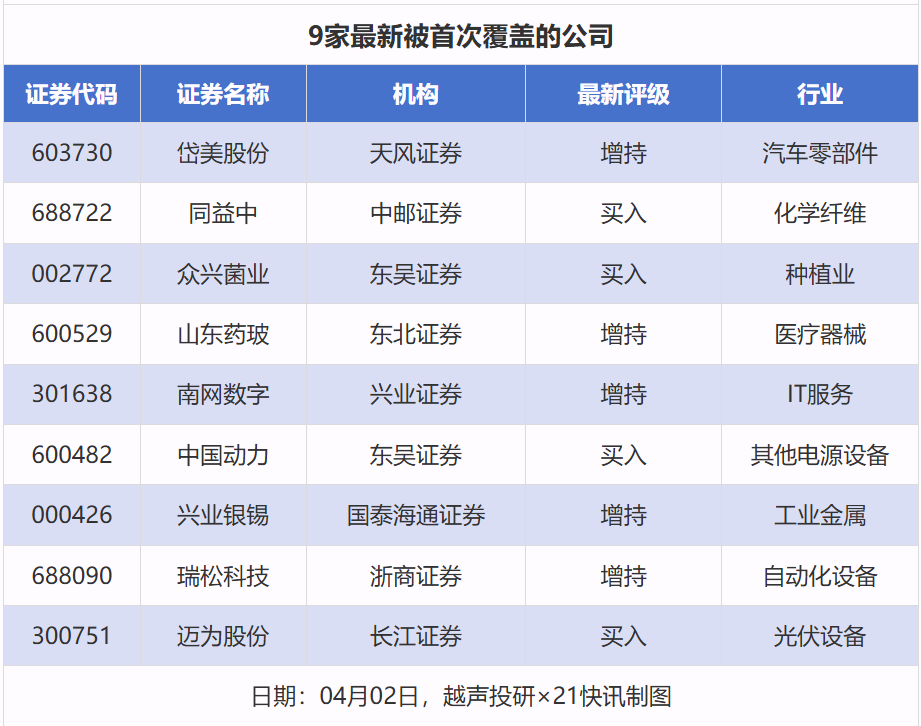首次覆盖方面,4月2日券商共给出了9次首次覆盖,其中岱美股份获得天风证券给予“增持”评级,同益中获得中邮证券给予“买入”评级,众兴菌业获得东吴证券给予“买入”评级,山东药玻获得东北证券给予“增持”评级,南网数字获得兴业证券给予“增持”评级。