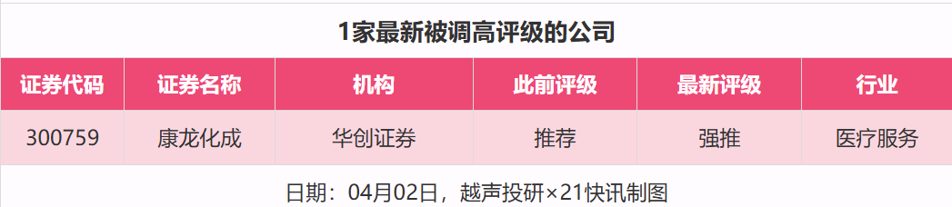 评级调高方面,4月2日,券商调高1家上市公司评级,华创证券对康龙化成的评级从“推荐”调高至“强推”。