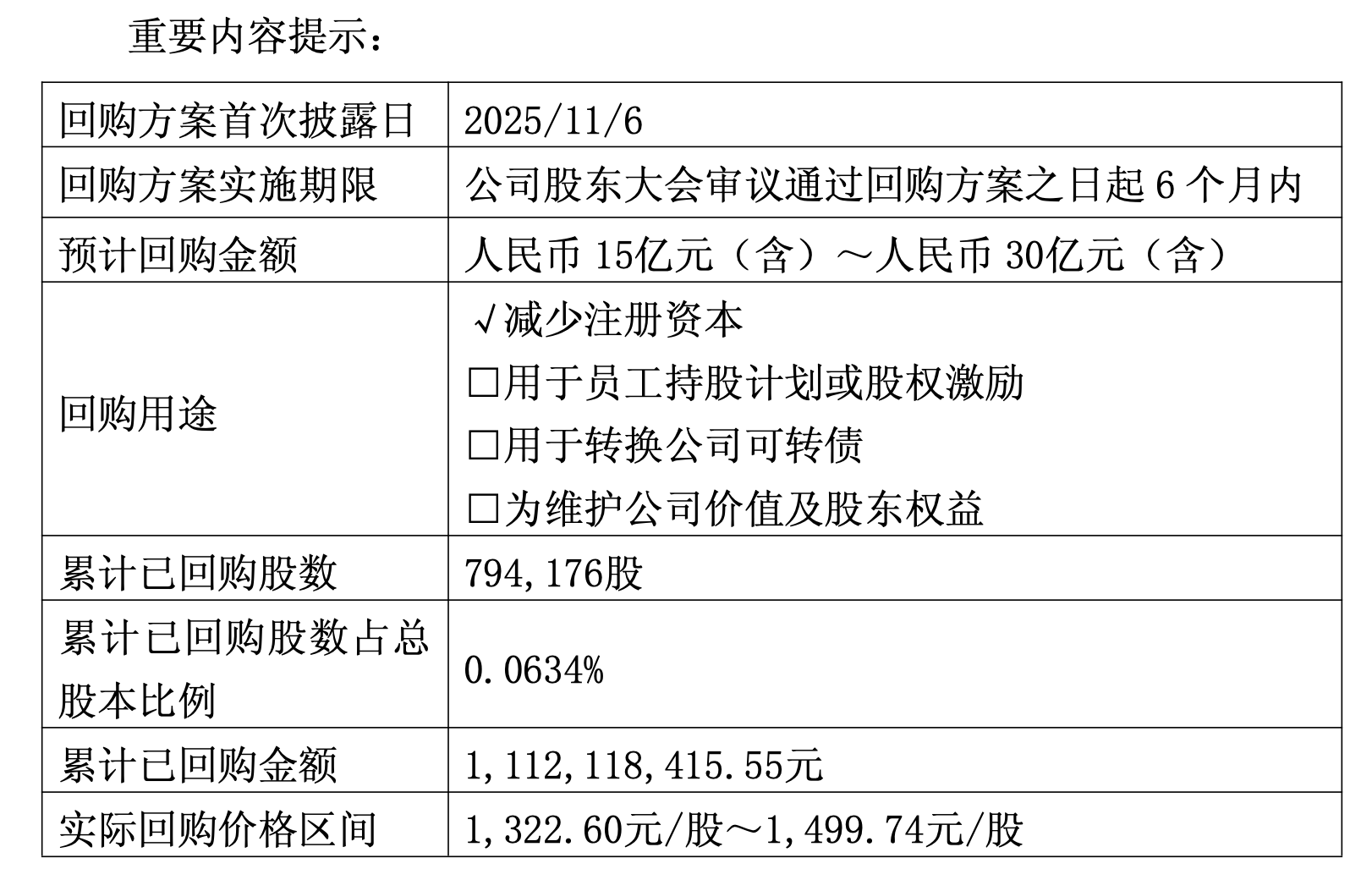 公开资料显示,此次回购方案最早在去年11月6日首次披露,并在同年11月28日经2025年第一次临时股东大会审议通过。根据方案,公司拟使用自有资金通过集中竞价交易方式回购股份,用于注销并减少注册资本,回购价格不超过1863.67元/股,回购金额区间为15亿元(含)至30亿元(含),实施期限为股东大会审议通过之日起6个月内,即今年5月28日截止。
