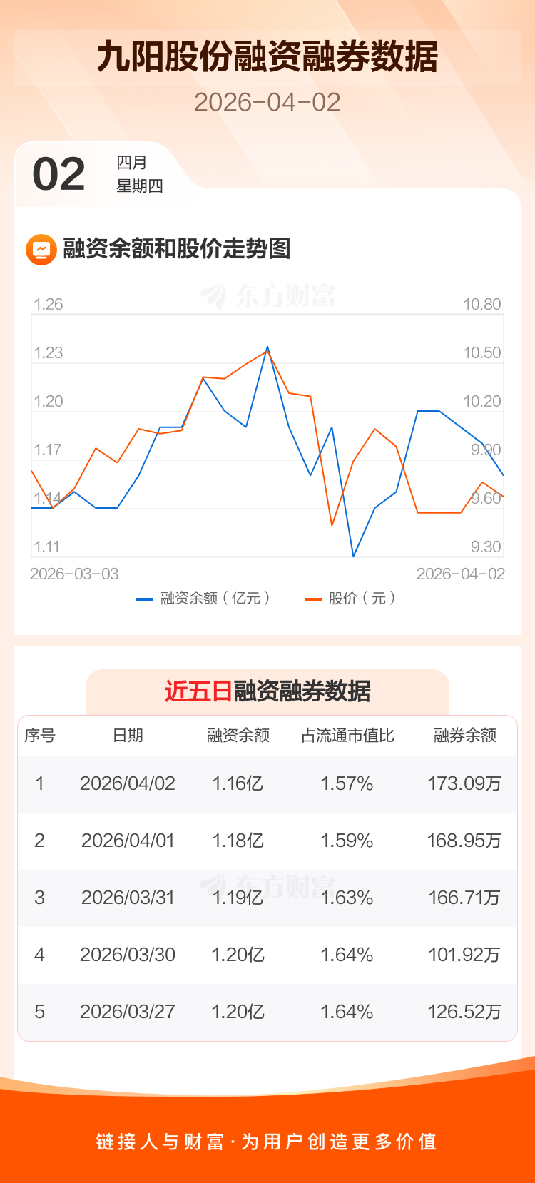 交易所最新数据显示,九阳股份于2026年4月2日获融资买入303.87万元,融资偿还554.23万元,当日融资净偿还250.35万元。目前,该股融资余额1.16亿,占流通市值比例为1.57%。