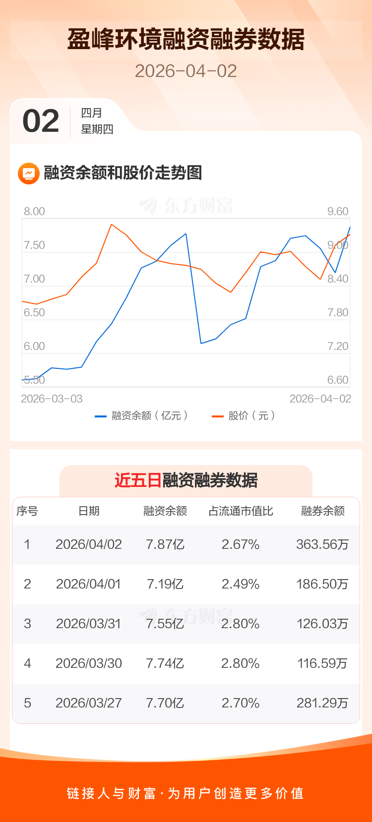 交易所最新数据显示,盈峰环境于2026年4月2日获融资买入2.41亿元,融资偿还1.73亿元,当日融资净买入6785.77万元。目前,该股融资余额7.87亿,占流通市值比例为2.67%。