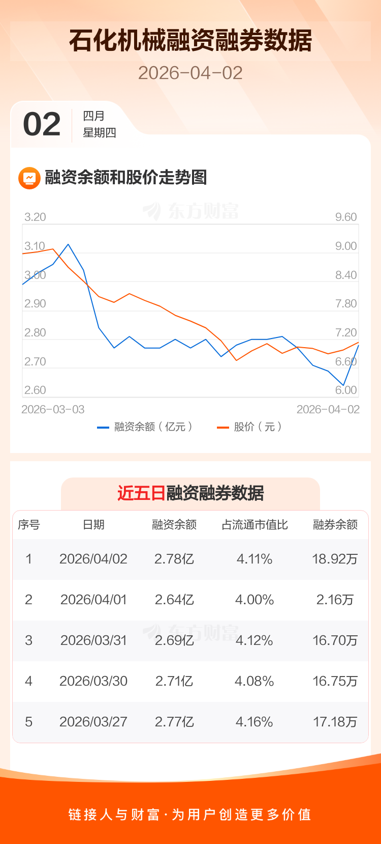 交易所最新数据显示,石化机械于2026年4月2日获融资买入3406.09万元,融资偿还2011.49万元,当日融资净买入1394.6万元。目前,该股融资余额2.78亿,占流通市值比例为4.11%。