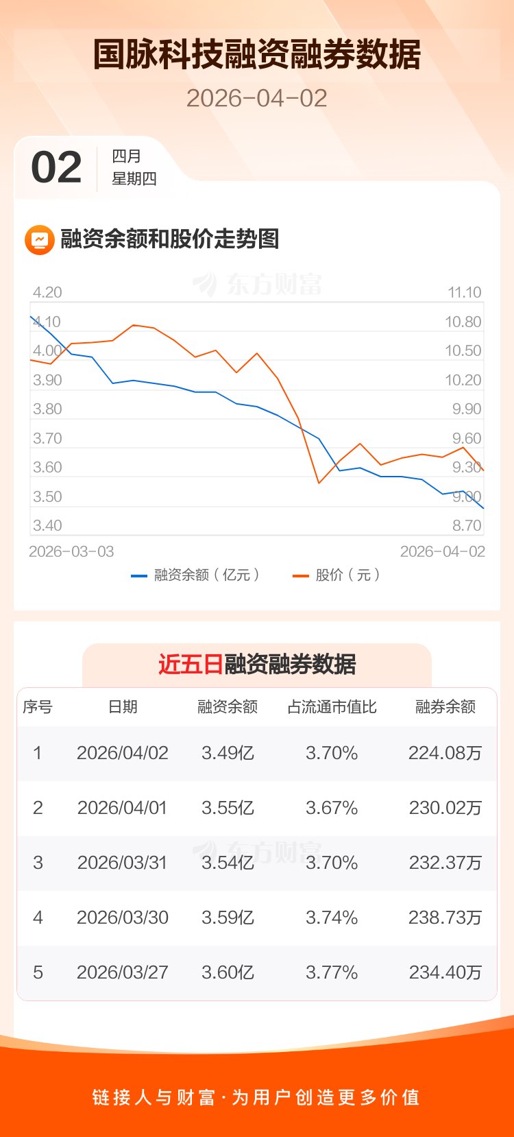 交易所最新数据显示,国脉科技于2026年4月2日获融资买入675.60万元,融资偿还1266.82万元,当日融资净偿还591.21万元。目前,该股融资余额3.49亿,占流通市值比例为3.70%。