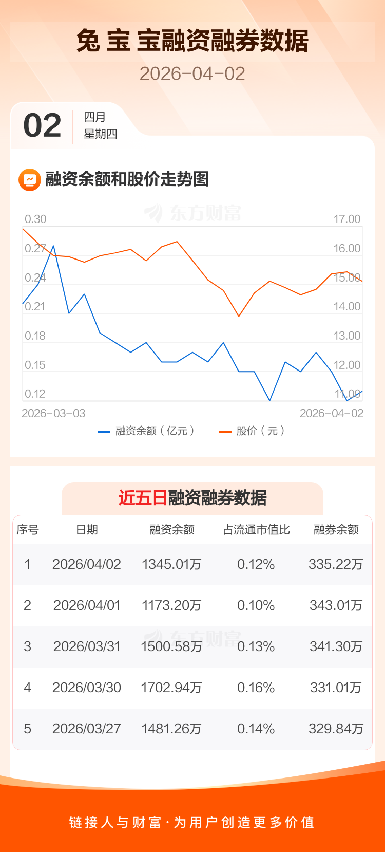 交易所最新数据显示,兔 宝 宝于2026年4月2日获融资买入569.53万元,融资偿还397.72万元,当日融资净买入171.81万元。目前,该股融资余额1345.01万,占流通市值比例为0.12%。