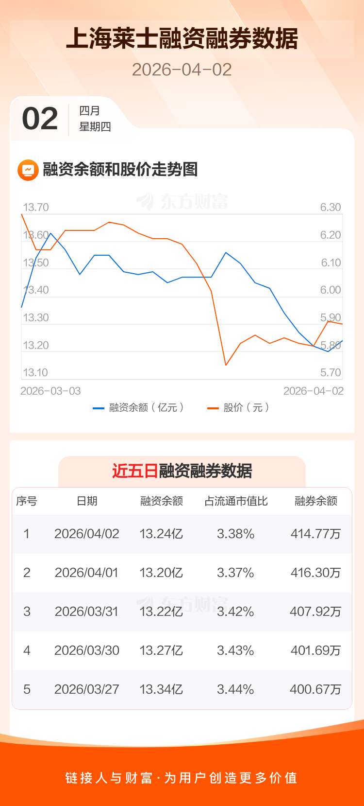 交易所最新数据显示,上海莱士于2026年4月2日获融资买入2431.47万元,融资偿还2071.50万元,当日融资净买入359.97万元。目前,该股融资余额13.24亿,占流通市值比例为3.38%。